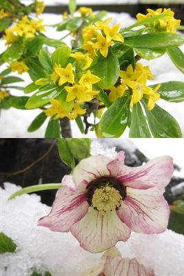 写真は自宅の庭に花咲く難波津(夏坊主)・春の貴婦人クリスマスローズに雪が被ったところです