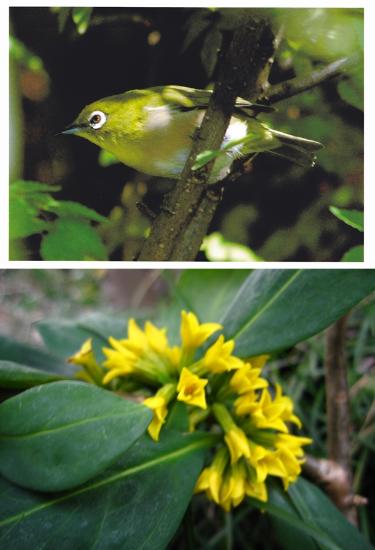 春の兆しをと思いメジロと自宅の咲き始めた夏坊主の1写真としました。