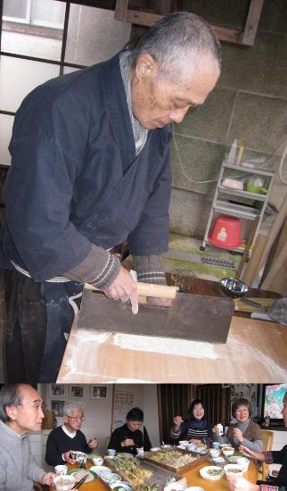 丸松さんの台所で蕎麦茹でもし、楽しい蕎麦を食べる会の開幕となり、丸松さんの友人で料理人高見さん手製の春の山菜かき揚げてんぷら、蕗の薹のてんぷら、温かいけんちん汁も用意してくだり豪華な宴会となりました。稲葉大和氏ご夫妻も参加され、昔話にも花咲き本当に楽しい半日で昼前から始め、お開きは5時頃になっていました。正しくあっという間に時間は過ぎて、それほど楽しい日だったということです。